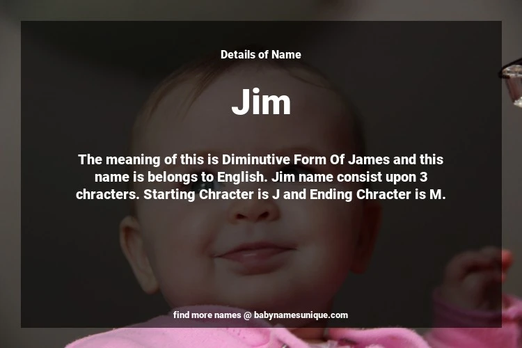 The name Jim is chosen by those who are willing to find Unique Boy Baby Names. The meaning of this is Diminutive Form Of James and this name is belongs to English Origin. Baby Name Jim consist upon 3 chracters. Starting alphabet is J and ending alphabet is M. This name is used primarily by parents who are considering unique baby names for Boy. The Zodiac Sign suitbale for this name are;