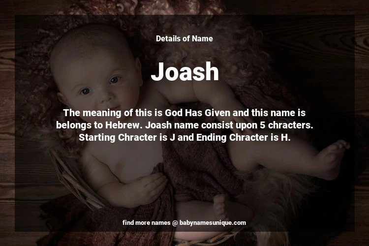 The name Joash is chosen by those who are willing to find Unique Boy Baby Names. The meaning of this is God Has Given and this name is belongs to Hebrew Origin. Baby Name Joash consist upon 5 chracters. Starting alphabet is J and ending alphabet is H. This name is used primarily by parents who are considering unique baby names for Boy. The Zodiac Sign suitbale for this name are;