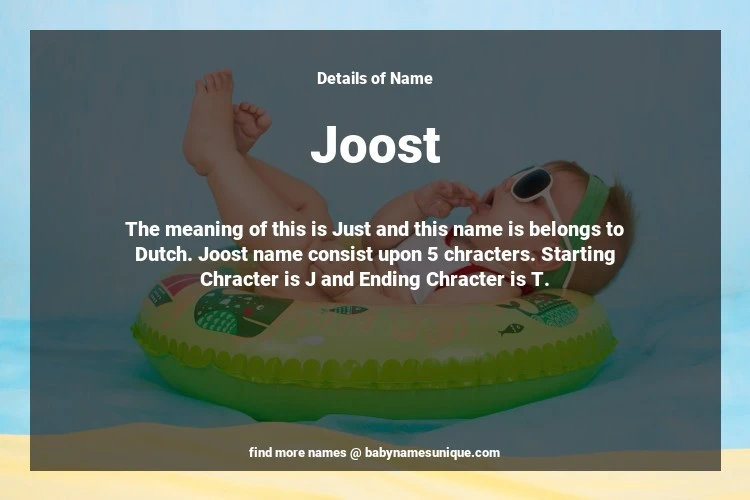The name Joost is chosen by those who are willing to find Unique Boy Baby Names. The meaning of this is Just and this name is belongs to Dutch Origin. Baby Name Joost consist upon 5 chracters. Starting alphabet is J and ending alphabet is T. This name is used primarily by parents who are considering unique baby names for Boy. The Zodiac Sign suitbale for this name are;