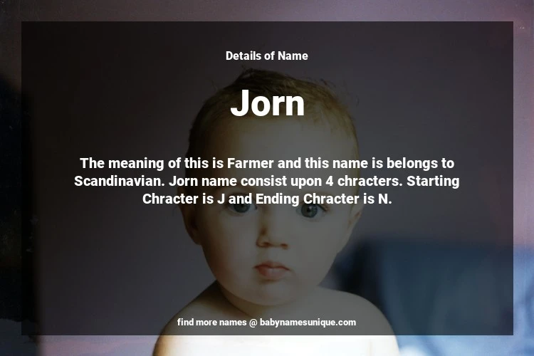 The name Jorn is chosen by those who are willing to find Unique Boy Baby Names. The meaning of this is Farmer and this name is belongs to Scandinavian Origin. Baby Name Jorn consist upon 4 chracters. Starting alphabet is J and ending alphabet is N. This name is used primarily by parents who are considering unique baby names for Boy. The Zodiac Sign suitbale for this name are;