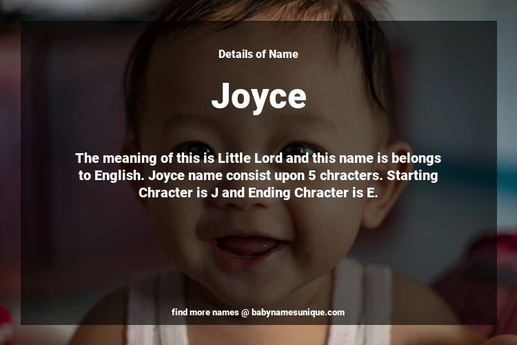 The name Joyce is chosen by those who are willing to find Unique Transgenders Baby Names. The meaning of this is Little Lord and this name is belongs to English Origin. Baby Name Joyce consist upon 5 chracters. Starting alphabet is J and ending alphabet is E. This name is used primarily by parents who are considering unique baby names for Transgenders. The Zodiac Sign suitbale for this name are;