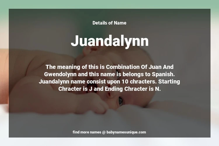 The name Juandalynn is chosen by those who are willing to find Unique Transgenders Baby Names. The meaning of this is Combination Of Juan And Gwendolynn and this name is belongs to Spanish Origin. Baby Name Juandalynn consist upon 10 chracters. Starting alphabet is J and ending alphabet is N. This name is used primarily by parents who are considering unique baby names for Transgenders. The Zodiac Sign suitbale for this name are;