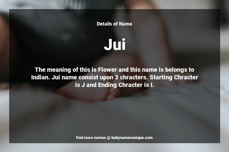 The name Jui is chosen by those who are willing to find Unique Transgenders Baby Names. The meaning of this is Flower and this name is belongs to Indian Origin. Baby Name Jui consist upon 3 chracters. Starting alphabet is J and ending alphabet is I. This name is used primarily by parents who are considering unique baby names for Transgenders. The Zodiac Sign suitbale for this name are;