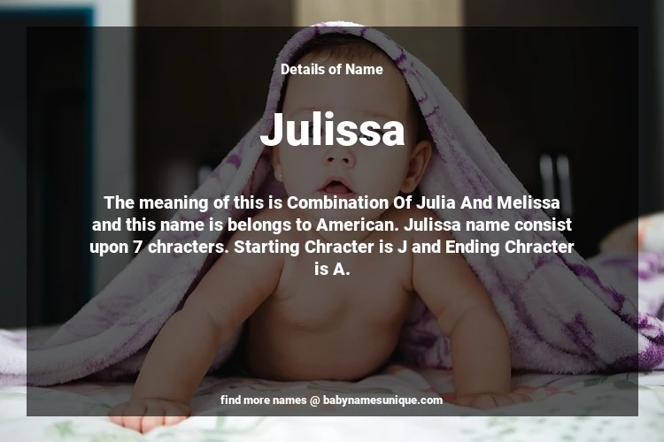 The name Julissa is chosen by those who are willing to find Unique Transgenders Baby Names. The meaning of this is Combination Of Julia And Melissa and this name is belongs to American Origin. Baby Name Julissa consist upon 7 chracters. Starting alphabet is J and ending alphabet is A. This name is used primarily by parents who are considering unique baby names for Transgenders. The Zodiac Sign suitbale for this name are;