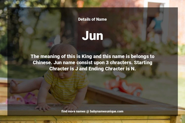 The name Jun is chosen by those who are willing to find Unique Transgenders Baby Names. The meaning of this is King and this name is belongs to Chinese Origin. Baby Name Jun consist upon 3 chracters. Starting alphabet is J and ending alphabet is N. This name is used primarily by parents who are considering unique baby names for Transgenders. The Zodiac Sign suitbale for this name are;