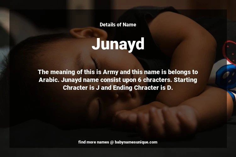 The name Junayd is chosen by those who are willing to find Unique Boy Baby Names. The meaning of this is Army and this name is belongs to Arabic Origin. Baby Name Junayd consist upon 6 chracters. Starting alphabet is J and ending alphabet is D. This name is used primarily by parents who are considering unique baby names for Boy. The Zodiac Sign suitbale for this name are;