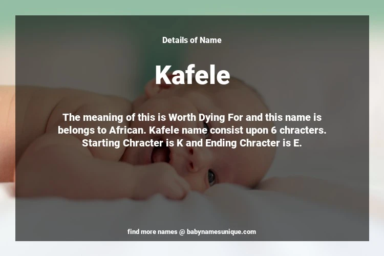 The name Kafele is chosen by those who are willing to find Unique Boy Baby Names. The meaning of this is Worth Dying For and this name is belongs to African Origin. Baby Name Kafele consist upon 6 chracters. Starting alphabet is K and ending alphabet is E. This name is used primarily by parents who are considering unique baby names for Boy. The Zodiac Sign suitbale for this name are;