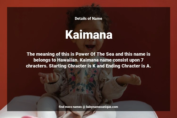 The name Kaimana is chosen by those who are willing to find Unique Transgenders Baby Names. The meaning of this is Power Of The Sea and this name is belongs to Hawaiian Origin. Baby Name Kaimana consist upon 7 chracters. Starting alphabet is K and ending alphabet is A. This name is used primarily by parents who are considering unique baby names for Transgenders. The Zodiac Sign suitbale for this name are;