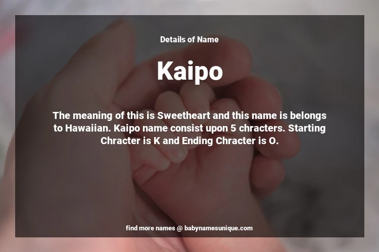 The name Kaipo is chosen by those who are willing to find Unique Transgenders Baby Names. The meaning of this is Sweetheart and this name is belongs to Hawaiian Origin. Baby Name Kaipo consist upon 5 chracters. Starting alphabet is K and ending alphabet is O. This name is used primarily by parents who are considering unique baby names for Transgenders. The Zodiac Sign suitbale for this name are;