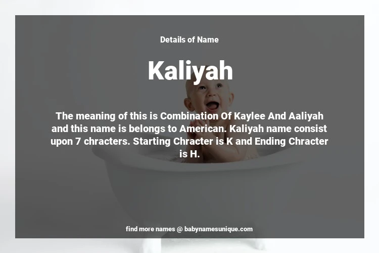 The name Kaliyah is chosen by those who are willing to find Unique Transgenders Baby Names. The meaning of this is Combination Of Kaylee And Aaliyah and this name is belongs to American Origin. Baby Name Kaliyah consist upon 7 chracters. Starting alphabet is K and ending alphabet is H. This name is used primarily by parents who are considering unique baby names for Transgenders. The Zodiac Sign suitbale for this name are;