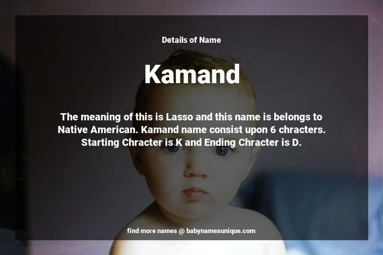 The name Kamand is chosen by those who are willing to find Unique Transgenders Baby Names. The meaning of this is Lasso and this name is belongs to Native American Origin. Baby Name Kamand consist upon 6 chracters. Starting alphabet is K and ending alphabet is D. This name is used primarily by parents who are considering unique baby names for Transgenders. The Zodiac Sign suitbale for this name are;