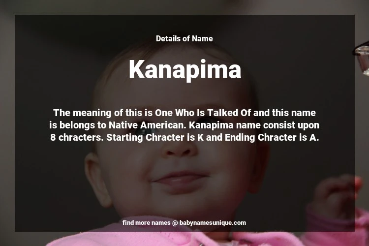 The name Kanapima is chosen by those who are willing to find Unique Transgenders Baby Names. The meaning of this is One Who Is Talked Of and this name is belongs to Native American Origin. Baby Name Kanapima consist upon 8 chracters. Starting alphabet is K and ending alphabet is A. This name is used primarily by parents who are considering unique baby names for Transgenders. The Zodiac Sign suitbale for this name are;
