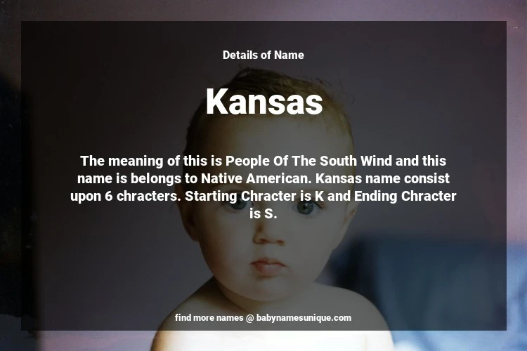 The name Kansas is chosen by those who are willing to find Unique Transgenders Baby Names. The meaning of this is People Of The South Wind and this name is belongs to Native American Origin. Baby Name Kansas consist upon 6 chracters. Starting alphabet is K and ending alphabet is S. This name is used primarily by parents who are considering unique baby names for Transgenders. The Zodiac Sign suitbale for this name are;