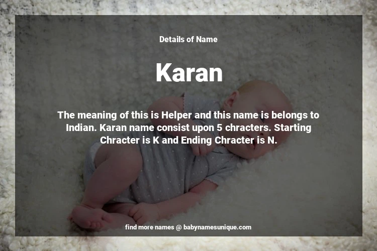 The name Karan is chosen by those who are willing to find Unique Boy Baby Names. The meaning of this is Helper and this name is belongs to Indian Origin. Baby Name Karan consist upon 5 chracters. Starting alphabet is K and ending alphabet is N. This name is used primarily by parents who are considering unique baby names for Boy. The Zodiac Sign suitbale for this name are;
