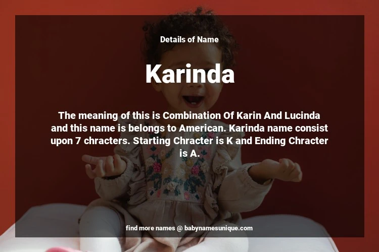 The name Karinda is chosen by those who are willing to find Unique Transgenders Baby Names. The meaning of this is Combination Of Karin And Lucinda and this name is belongs to American Origin. Baby Name Karinda consist upon 7 chracters. Starting alphabet is K and ending alphabet is A. This name is used primarily by parents who are considering unique baby names for Transgenders. The Zodiac Sign suitbale for this name are;