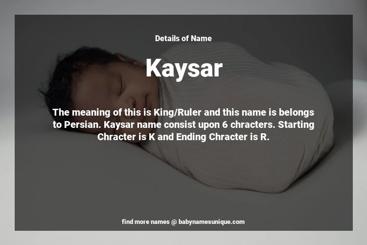 The name Kaysar is chosen by those who are willing to find Unique Boy Baby Names. The meaning of this is King/Ruler and this name is belongs to Persian Origin. Baby Name Kaysar consist upon 6 chracters. Starting alphabet is K and ending alphabet is R. This name is used primarily by parents who are considering unique baby names for Boy. The Zodiac Sign suitbale for this name are;