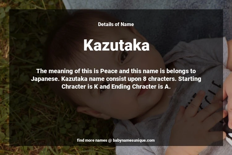 The name Kazutaka is chosen by those who are willing to find Unique Boy Baby Names. The meaning of this is Peace and this name is belongs to Japanese Origin. Baby Name Kazutaka consist upon 8 chracters. Starting alphabet is K and ending alphabet is A. This name is used primarily by parents who are considering unique baby names for Boy. The Zodiac Sign suitbale for this name are;