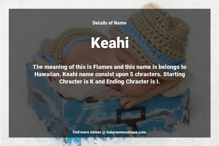 The name Keahi is chosen by those who are willing to find Unique Transgenders Baby Names. The meaning of this is Flames and this name is belongs to Hawaiian Origin. Baby Name Keahi consist upon 5 chracters. Starting alphabet is K and ending alphabet is I. This name is used primarily by parents who are considering unique baby names for Transgenders. The Zodiac Sign suitbale for this name are;