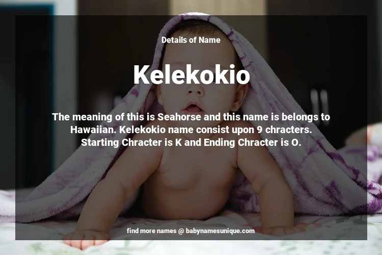The name Kelekokio is chosen by those who are willing to find Unique Transgenders Baby Names. The meaning of this is Seahorse and this name is belongs to Hawaiian Origin. Baby Name Kelekokio consist upon 9 chracters. Starting alphabet is K and ending alphabet is O. This name is used primarily by parents who are considering unique baby names for Transgenders. The Zodiac Sign suitbale for this name are;