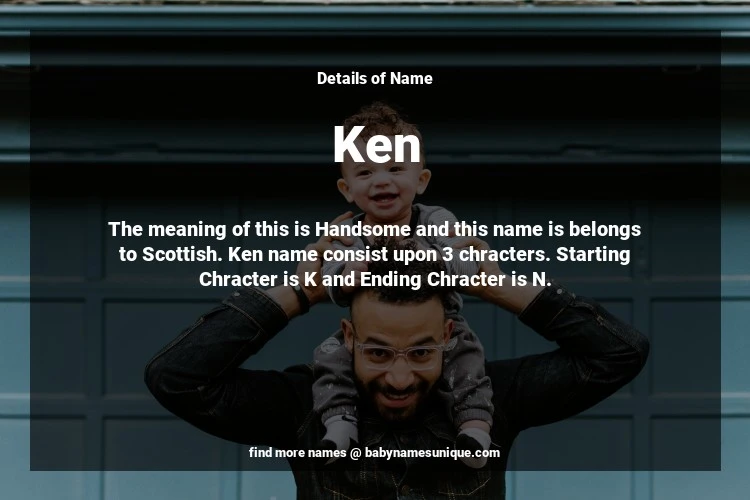 The name Ken is chosen by those who are willing to find Unique Boy Baby Names. The meaning of this is Handsome and this name is belongs to Scottish Origin. Baby Name Ken consist upon 3 chracters. Starting alphabet is K and ending alphabet is N. This name is used primarily by parents who are considering unique baby names for Boy. The Zodiac Sign suitbale for this name are;