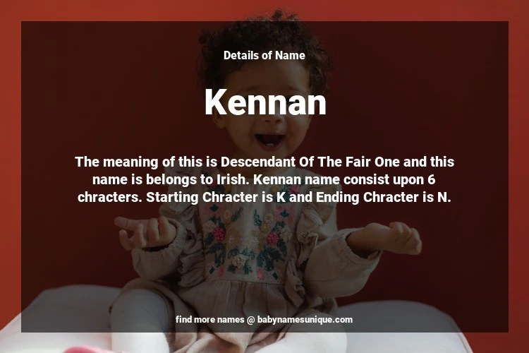 The name Kennan is chosen by those who are willing to find Unique Boy Baby Names. The meaning of this is Descendant Of The Fair One and this name is belongs to Irish Origin. Baby Name Kennan consist upon 6 chracters. Starting alphabet is K and ending alphabet is N. This name is used primarily by parents who are considering unique baby names for Boy. The Zodiac Sign suitbale for this name are;