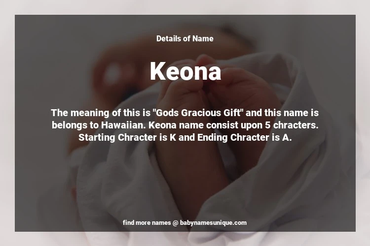 The name Keona is chosen by those who are willing to find Unique Transgenders Baby Names. The meaning of this is "Gods Gracious Gift" and this name is belongs to Hawaiian Origin. Baby Name Keona consist upon 5 chracters. Starting alphabet is K and ending alphabet is A. This name is used primarily by parents who are considering unique baby names for Transgenders. The Zodiac Sign suitbale for this name are;