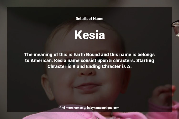 The name Kesia is chosen by those who are willing to find Unique Transgenders Baby Names. The meaning of this is Earth Bound and this name is belongs to American Origin. Baby Name Kesia consist upon 5 chracters. Starting alphabet is K and ending alphabet is A. This name is used primarily by parents who are considering unique baby names for Transgenders. The Zodiac Sign suitbale for this name are;