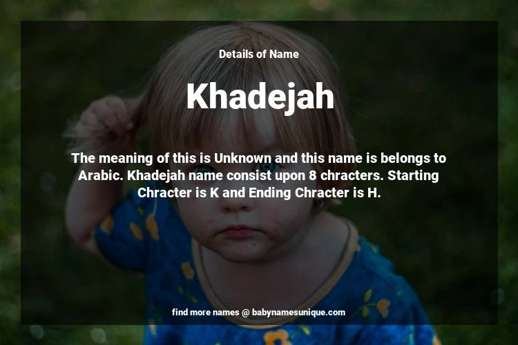 The name Khadejah is chosen by those who are willing to find Unique Transgenders Baby Names. The meaning of this is Unknown and this name is belongs to Arabic Origin. Baby Name Khadejah consist upon 8 chracters. Starting alphabet is K and ending alphabet is H. This name is used primarily by parents who are considering unique baby names for Transgenders. The Zodiac Sign suitbale for this name are;