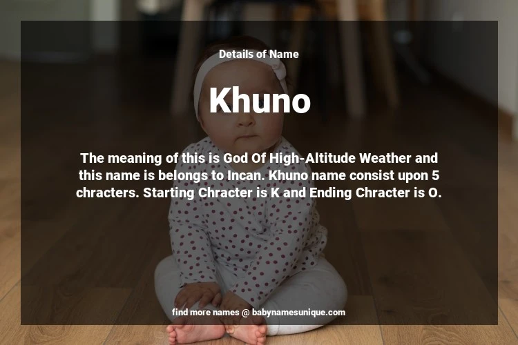 The name Khuno is chosen by those who are willing to find Unique Boy Baby Names. The meaning of this is God Of High-Altitude Weather and this name is belongs to Incan Origin. Baby Name Khuno consist upon 5 chracters. Starting alphabet is K and ending alphabet is O. This name is used primarily by parents who are considering unique baby names for Boy. The Zodiac Sign suitbale for this name are;