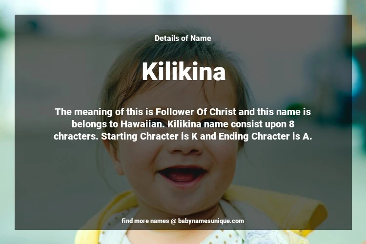 The name Kilikina is chosen by those who are willing to find Unique Transgenders Baby Names. The meaning of this is Follower Of Christ and this name is belongs to Hawaiian Origin. Baby Name Kilikina consist upon 8 chracters. Starting alphabet is K and ending alphabet is A. This name is used primarily by parents who are considering unique baby names for Transgenders. The Zodiac Sign suitbale for this name are;