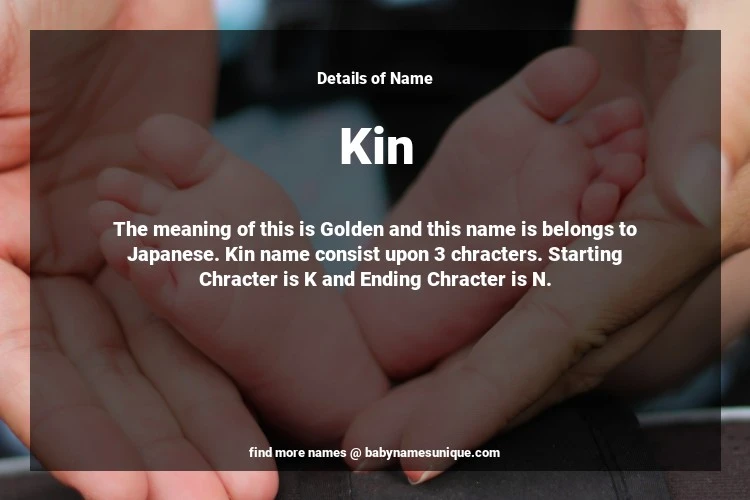 The name Kin is chosen by those who are willing to find Unique Transgenders Baby Names. The meaning of this is Golden and this name is belongs to Japanese Origin. Baby Name Kin consist upon 3 chracters. Starting alphabet is K and ending alphabet is N. This name is used primarily by parents who are considering unique baby names for Transgenders. The Zodiac Sign suitbale for this name are;