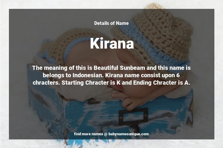 The name Kirana is chosen by those who are willing to find Unique Transgenders Baby Names. The meaning of this is Beautiful Sunbeam and this name is belongs to Indonesian Origin. Baby Name Kirana consist upon 6 chracters. Starting alphabet is K and ending alphabet is A. This name is used primarily by parents who are considering unique baby names for Transgenders. The Zodiac Sign suitbale for this name are;