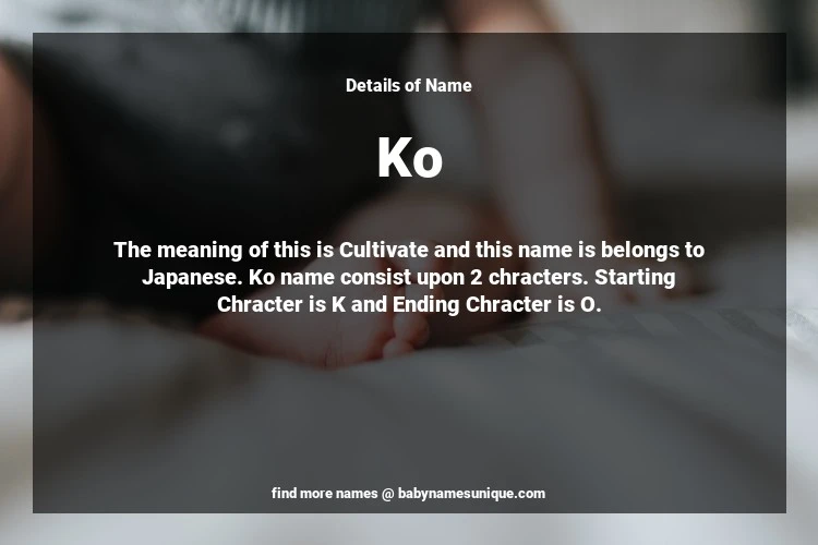 The name Ko is chosen by those who are willing to find Unique Boy Baby Names. The meaning of this is Cultivate and this name is belongs to Japanese Origin. Baby Name Ko consist upon 2 chracters. Starting alphabet is K and ending alphabet is O. This name is used primarily by parents who are considering unique baby names for Boy. The Zodiac Sign suitbale for this name are;