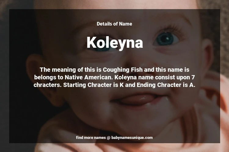 The name Koleyna is chosen by those who are willing to find Unique Transgenders Baby Names. The meaning of this is Coughing Fish and this name is belongs to Native American Origin. Baby Name Koleyna consist upon 7 chracters. Starting alphabet is K and ending alphabet is A. This name is used primarily by parents who are considering unique baby names for Transgenders. The Zodiac Sign suitbale for this name are;