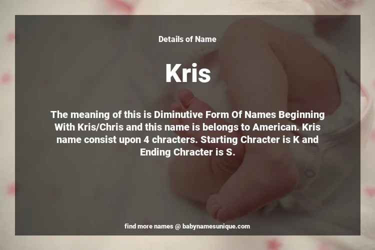 The name Kris is chosen by those who are willing to find Unique Transgenders Baby Names. The meaning of this is Diminutive Form Of Names Beginning With Kris/Chris and this name is belongs to American Origin. Baby Name Kris consist upon 4 chracters. Starting alphabet is K and ending alphabet is S. This name is used primarily by parents who are considering unique baby names for Transgenders. The Zodiac Sign suitbale for this name are;
