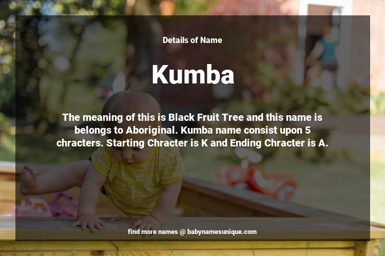 The name Kumba is chosen by those who are willing to find Unique Transgenders Baby Names. The meaning of this is Black Fruit Tree and this name is belongs to Aboriginal Origin. Baby Name Kumba consist upon 5 chracters. Starting alphabet is K and ending alphabet is A. This name is used primarily by parents who are considering unique baby names for Transgenders. The Zodiac Sign suitbale for this name are;