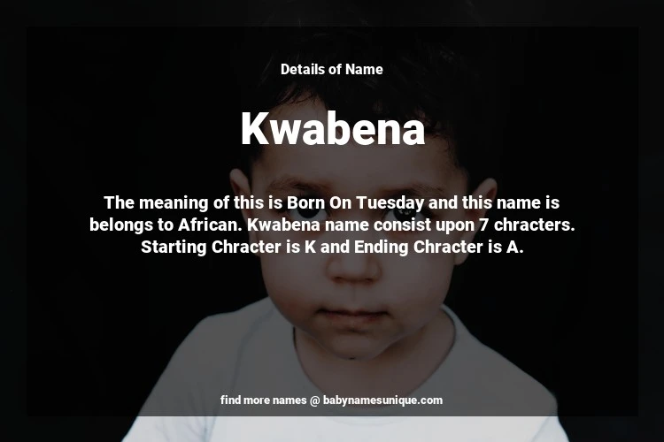 The name Kwabena is chosen by those who are willing to find Unique Boy Baby Names. The meaning of this is Born On Tuesday and this name is belongs to African Origin. Baby Name Kwabena consist upon 7 chracters. Starting alphabet is K and ending alphabet is A. This name is used primarily by parents who are considering unique baby names for Boy. The Zodiac Sign suitbale for this name are;