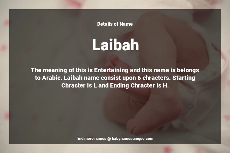 The name Laibah is chosen by those who are willing to find Unique Transgenders Baby Names. The meaning of this is Entertaining and this name is belongs to Arabic Origin. Baby Name Laibah consist upon 6 chracters. Starting alphabet is L and ending alphabet is H. This name is used primarily by parents who are considering unique baby names for Transgenders. The Zodiac Sign suitbale for this name are;
