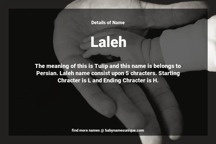 The name Laleh is chosen by those who are willing to find Unique Transgenders Baby Names. The meaning of this is Tulip and this name is belongs to Persian Origin. Baby Name Laleh consist upon 5 chracters. Starting alphabet is L and ending alphabet is H. This name is used primarily by parents who are considering unique baby names for Transgenders. The Zodiac Sign suitbale for this name are;
