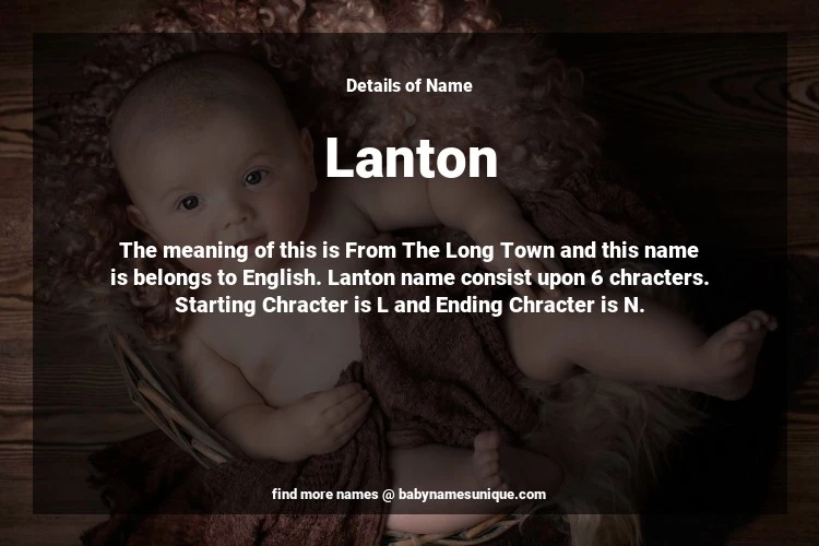 The name Lanton is chosen by those who are willing to find Unique Boy Baby Names. The meaning of this is From The Long Town and this name is belongs to English Origin. Baby Name Lanton consist upon 6 chracters. Starting alphabet is L and ending alphabet is N. This name is used primarily by parents who are considering unique baby names for Boy. The Zodiac Sign suitbale for this name are;