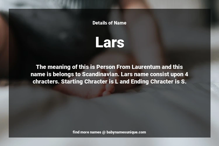The name Lars is chosen by those who are willing to find Unique Boy Baby Names. The meaning of this is Person From Laurentum and this name is belongs to Scandinavian Origin. Baby Name Lars consist upon 4 chracters. Starting alphabet is L and ending alphabet is S. This name is used primarily by parents who are considering unique baby names for Boy. The Zodiac Sign suitbale for this name are;