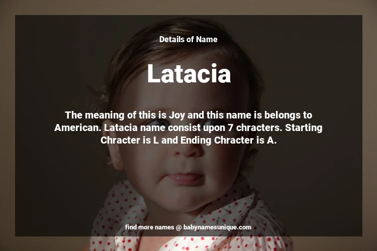 The name Latacia is chosen by those who are willing to find Unique Transgenders Baby Names. The meaning of this is Joy and this name is belongs to American Origin. Baby Name Latacia consist upon 7 chracters. Starting alphabet is L and ending alphabet is A. This name is used primarily by parents who are considering unique baby names for Transgenders. The Zodiac Sign suitbale for this name are;