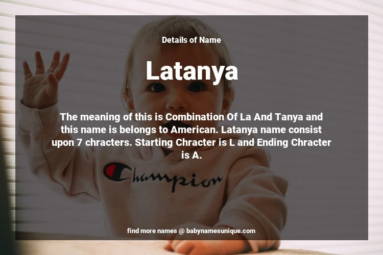 The name Latanya is chosen by those who are willing to find Unique Transgenders Baby Names. The meaning of this is Combination Of La And Tanya and this name is belongs to American Origin. Baby Name Latanya consist upon 7 chracters. Starting alphabet is L and ending alphabet is A. This name is used primarily by parents who are considering unique baby names for Transgenders. The Zodiac Sign suitbale for this name are;