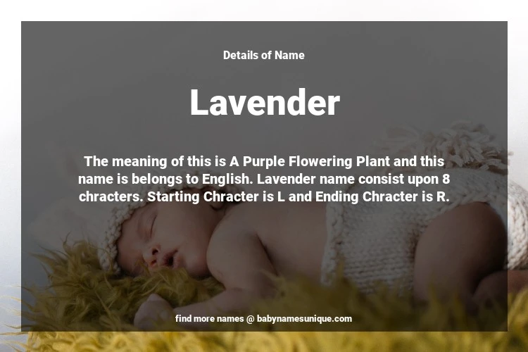The name Lavender is chosen by those who are willing to find Unique Transgenders Baby Names. The meaning of this is A Purple Flowering Plant and this name is belongs to English Origin. Baby Name Lavender consist upon 8 chracters. Starting alphabet is L and ending alphabet is R. This name is used primarily by parents who are considering unique baby names for Transgenders. The Zodiac Sign suitbale for this name are;