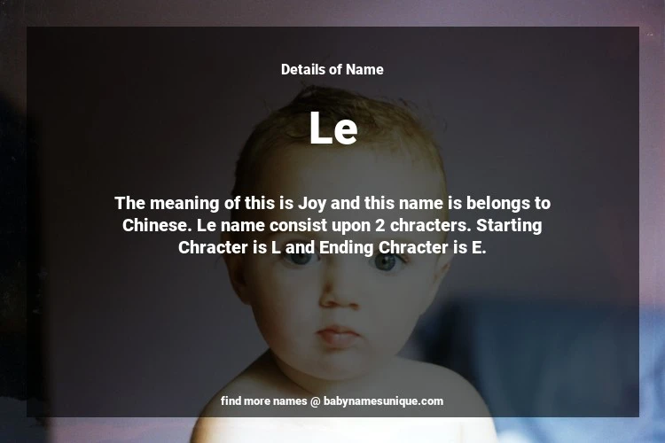 The name Le is chosen by those who are willing to find Unique Transgenders Baby Names. The meaning of this is Joy and this name is belongs to Chinese Origin. Baby Name Le consist upon 2 chracters. Starting alphabet is L and ending alphabet is E. This name is used primarily by parents who are considering unique baby names for Transgenders. The Zodiac Sign suitbale for this name are;