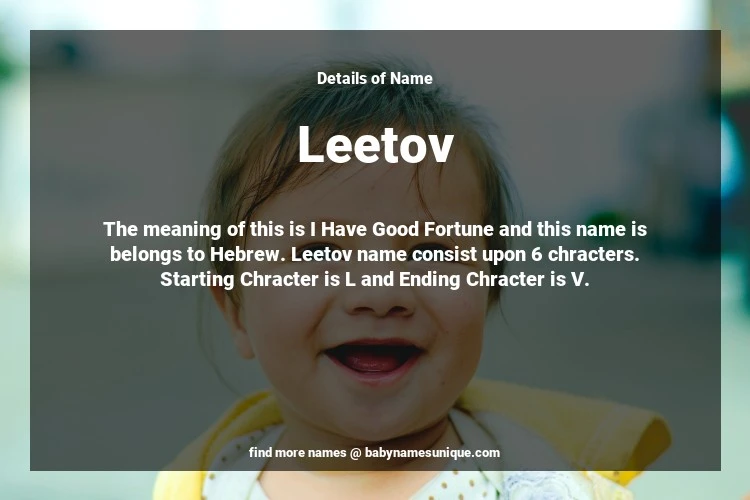 The name Leetov is chosen by those who are willing to find Unique Boy Baby Names. The meaning of this is I Have Good Fortune and this name is belongs to Hebrew Origin. Baby Name Leetov consist upon 6 chracters. Starting alphabet is L and ending alphabet is V. This name is used primarily by parents who are considering unique baby names for Boy. The Zodiac Sign suitbale for this name are;