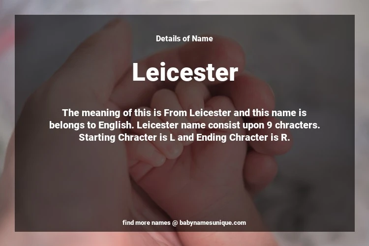 The name Leicester is chosen by those who are willing to find Unique Boy Baby Names. The meaning of this is From Leicester and this name is belongs to English Origin. Baby Name Leicester consist upon 9 chracters. Starting alphabet is L and ending alphabet is R. This name is used primarily by parents who are considering unique baby names for Boy. The Zodiac Sign suitbale for this name are;