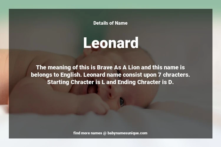 The name Leonard is chosen by those who are willing to find Unique Boy Baby Names. The meaning of this is Brave As A Lion and this name is belongs to English Origin. Baby Name Leonard consist upon 7 chracters. Starting alphabet is L and ending alphabet is D. This name is used primarily by parents who are considering unique baby names for Boy. The Zodiac Sign suitbale for this name are;