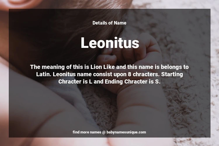 The name Leonitus is chosen by those who are willing to find Unique Boy Baby Names. The meaning of this is Lion Like and this name is belongs to Latin Origin. Baby Name Leonitus consist upon 8 chracters. Starting alphabet is L and ending alphabet is S. This name is used primarily by parents who are considering unique baby names for Boy. The Zodiac Sign suitbale for this name are;
