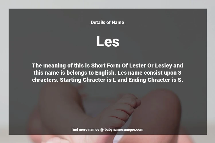 The name Les is chosen by those who are willing to find Unique Transgenders Baby Names. The meaning of this is Short Form Of Lester Or Lesley and this name is belongs to English Origin. Baby Name Les consist upon 3 chracters. Starting alphabet is L and ending alphabet is S. This name is used primarily by parents who are considering unique baby names for Transgenders. The Zodiac Sign suitbale for this name are;